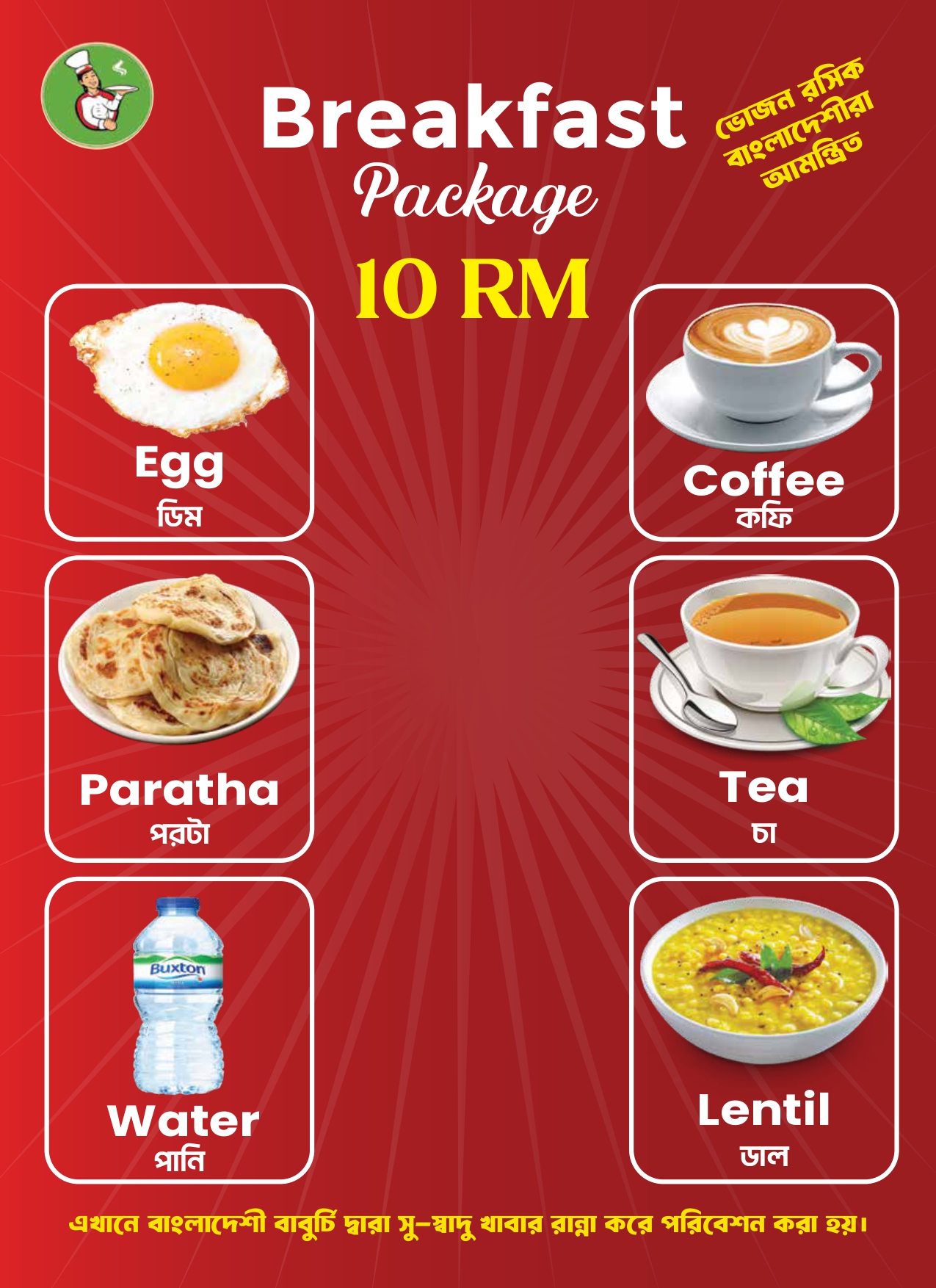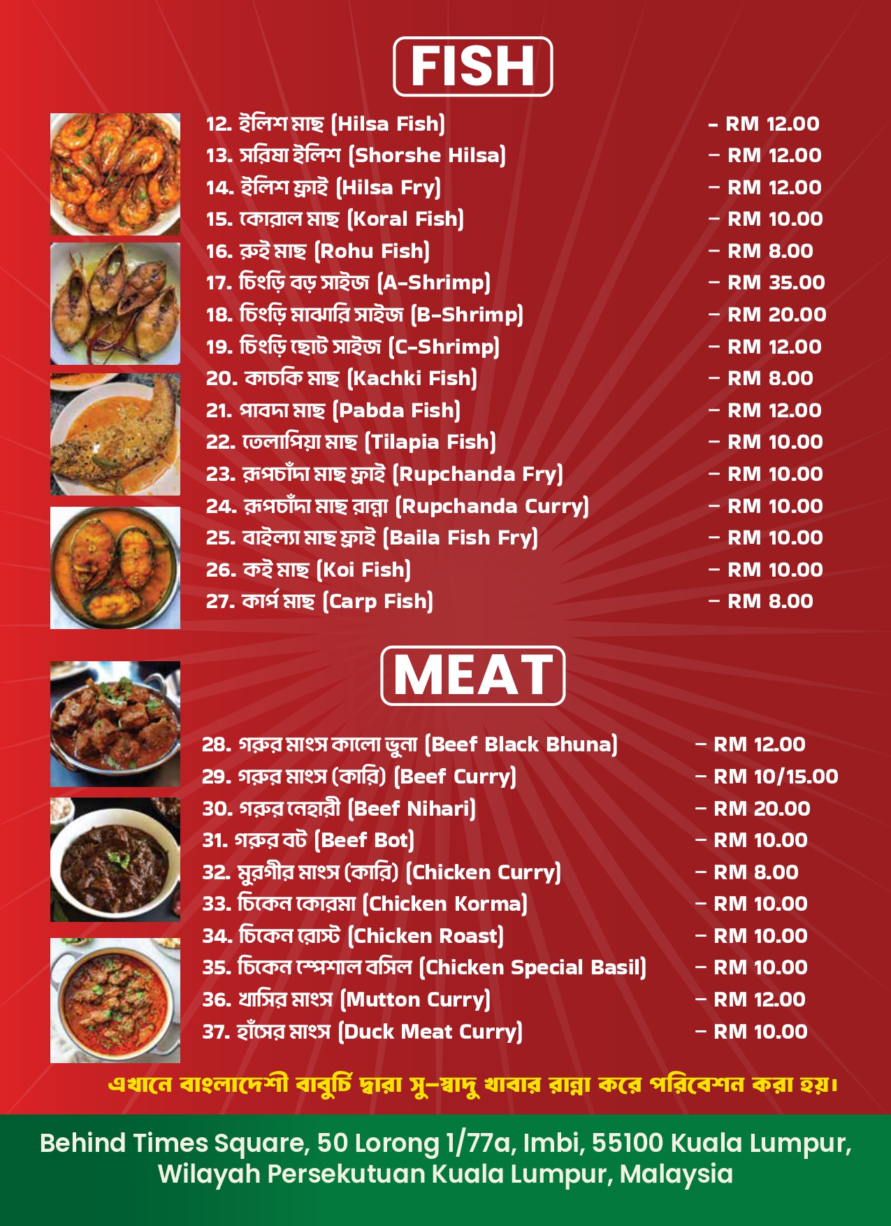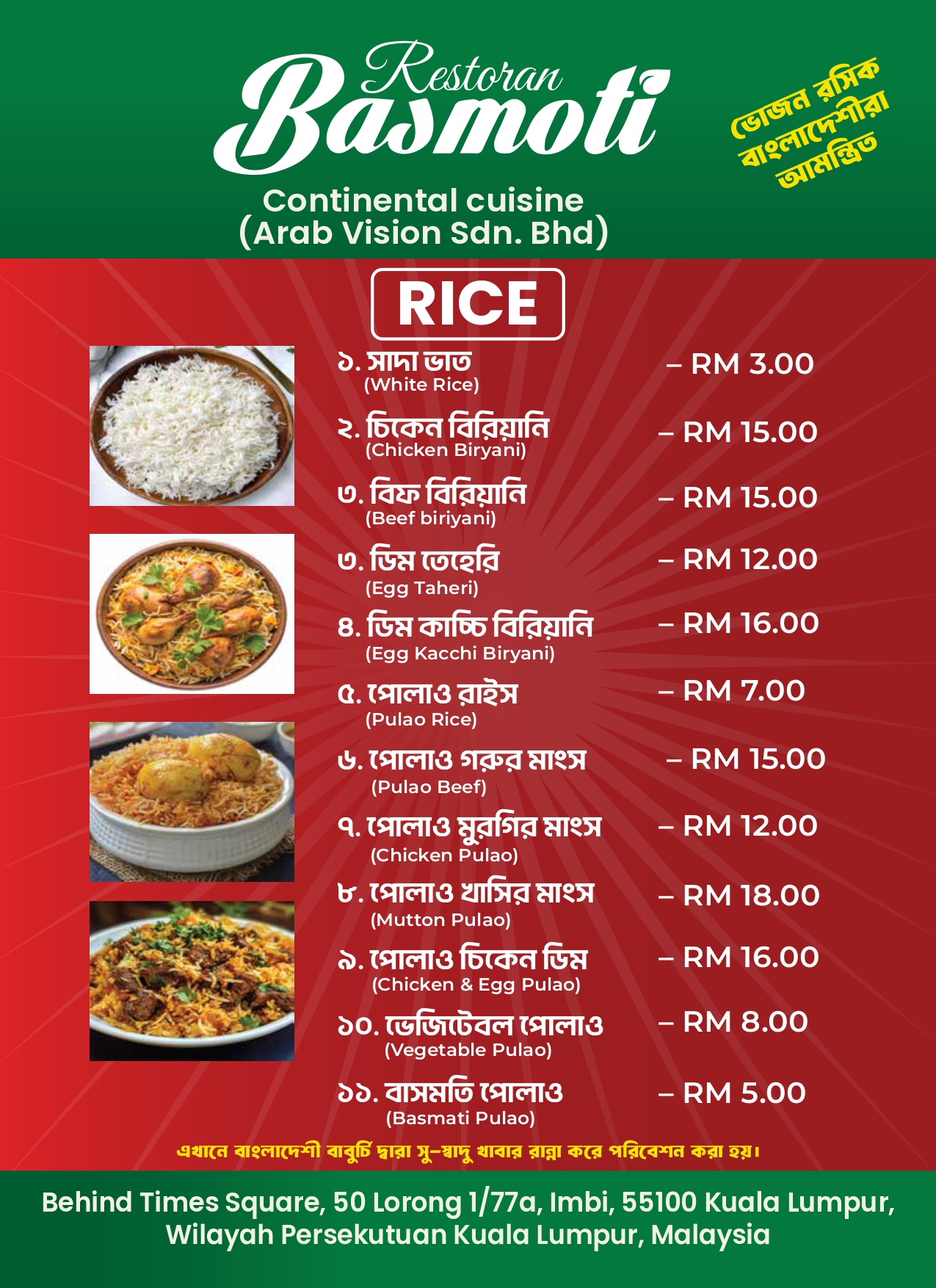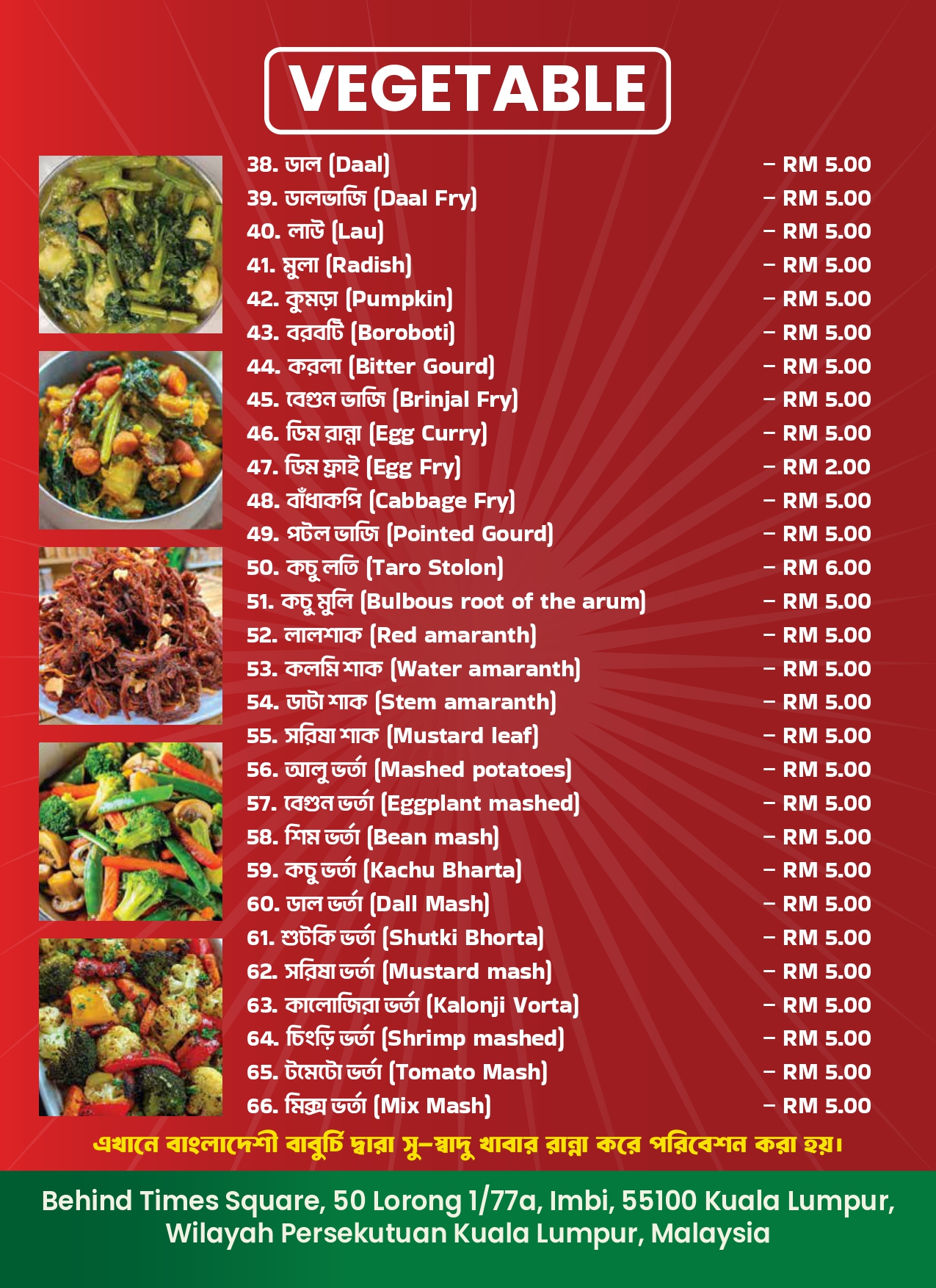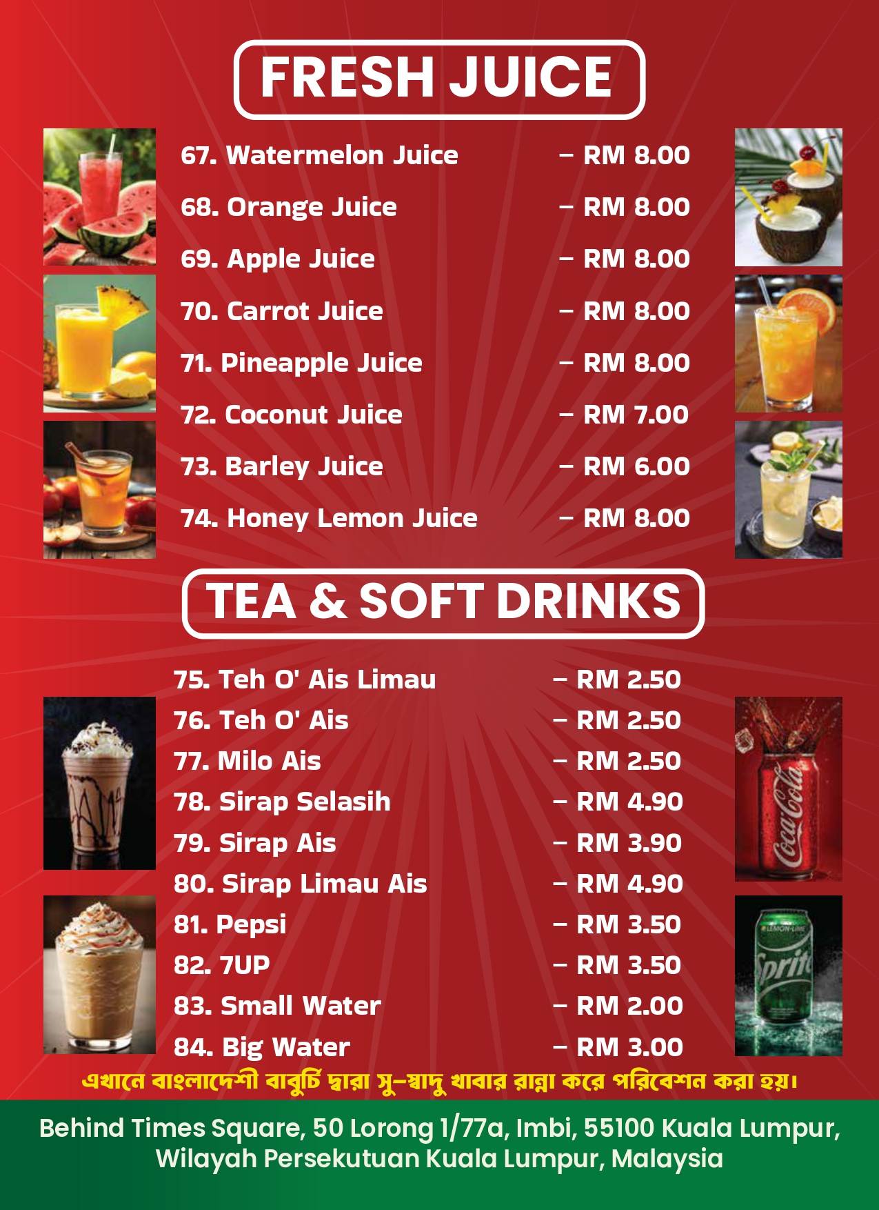 Our Menu From our chefs to our service team, we are committed to providing delicious food and a memorable dining experience for every guest. Rice White Rice RM2 Chicken Biryani RM14 Egg Taheri RM12 Egg Kacchi Biryani RM16 Chicken & Egg Pulao RM14 Basmoti Pulao RM5 Pulao Rice RM7 Pulao Beef RM14 Chicken Pulao RM12 Mutton Pulao RM15 Vegetable Pulao RM8 Rice Dall RM3 Dall Fry RM3 Lau RM5 Radish RM5 Pumpkin RM5 Borboti RM3 Bitter Gourd RM3 Brinjal Fry RM3 Egg Curry RM3 Egg Fry RM2 Cabbage Fry RM3 Pointed Gourd RM3 Arum-Lobe RM6 Kachu Mukhi RM5 Red Amaranth RM3 Water Amaranath RM7 Stem Amaranth RM14 Mustard Leaf RM3 Mashed Potatoes RM3 Eggplant Mashed RM3 Bean Mashed RM3 Kachu Bharta RM3 Dall Bharta RM3 Dry Stuff RM3 Mustard Mash RM3 Kalonji Vorta RM3 Shrimp Mashed RM3 Tomato Mashed RM3 Mix Mashed RM3 Fish Hilsa RM12 Shorshe Hilsa RM12 Hilsha Fry RM12 Koral Fish RM10 Rohu Fish RM6 A-Shrimp RM35 B-Shrimp RM20 C-Shrimp RM12 Fish Keski Fish RM8 Pabda Fish RM12 Tilapia Fish RM10 Rupchanda Fry RM8 Rupchanda Curry RM8 Baila Fish Fry RM10 Koi Fish RM10 Carp Fish RM8 Fresh Juice Watermelon juice RM8 Carrot Juice RM8 Lime Juice RM6 Orange Juice RM8 Pineapple Juice RM8 Honey Lemon Juice RM8 Apple Juice RM8 Coconut Juice RM7 Tea & Soft Drink Teh O' Ais Limau RM2.5 Sirap Selasih RM4.9 Pepsi RM3.9 Teh O' Ais RM2.5 Sirap Ais RM3.9 7up RM3.9 Milo Ais RM2.5 Sirap Limau Ais RM4.9 Mineral Water RM2 Plain Water RM0.5